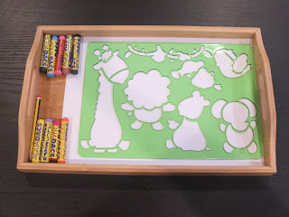 Embora obviamente ela ainda tenha dificuldade em usar o escantilhão (pois ainda nem domina a forma correta de agarrar o lápis), como tinha comprado um conjunto de escantilhões onde este estava incluído, decidi pô-lo à sua disposição.