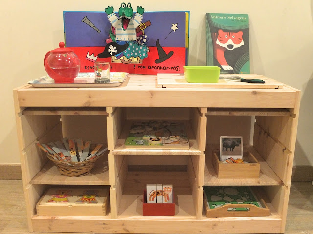 Na passada semana, decidi então manter aqueles brinquedos que suscitam mais o seu interesse sempre disponíveis no seu quarto e criar um móvel temático, onde disponibilizo jogos e atividades novas, bem como alguns brinquedos seus que se enquadram no tema.